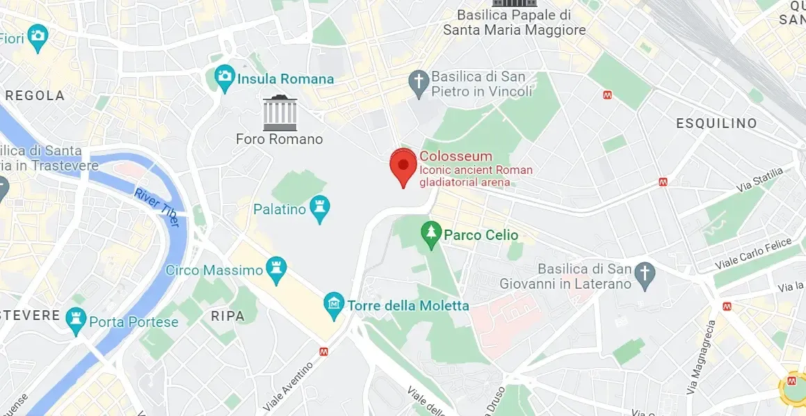 O Coliseu está localizado a cerca de 1 km a sudeste do centro histórico de Roma e a leste do conhecido Fórum Romano, um local que você pode alcançar facilmente por transporte público.